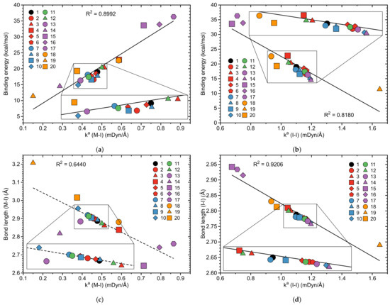 (a) Correlation between binding energy and local stretching force constant of the M–I bonds; (b) Correlation between binding energy and local stretching force constant of the I–I bonds; (c) Bond length r versus local stretching force constant for the M–I bonds; (d) Bond length r versus local stretching force constant for the I–I bonds of molecules 1–20. PBE0–D3(BJ)/aug–cc–pVTZ/PP(M,I) level of theory.