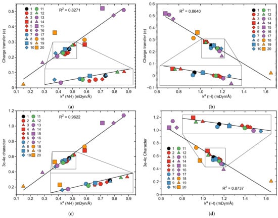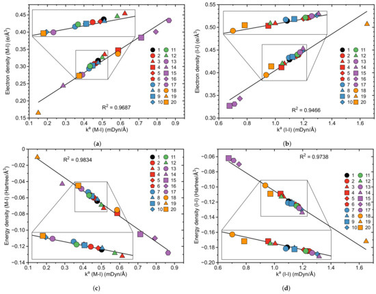 The correlation between bond strength as reflected by the values and electron density and energy density at the bond critical point for M–I and I–I bonds is the next topic. As reflected by the data collected in Table 1 all M–I and I–I bonds are of covalent nature according to the Cremer-Kraka criterion [105,106,107]. Complex 17 with the strongest M–I bond ( = 0.865 mDyn/Å) has the most negative value of the energy density ( = −0.128 Hartree/Å) corresponding to the most covalent character of our series, whereas complex 19 with the weakest M–I bond (the value = 0.150 mDyn/Å) has an energy density value closer to zero ( = −0.010 Hartree/Å), the onset of a chemical bond with a mixed electrostatic and covalent character. For the I–I bonds we find the largest negative value of −0.172 Hartree/Å for complex 19 and the smallest negative value of −0.065 Hartree/Å for complex 17, again reflecting the inverse strength and nature of the M–I and I–I bonds. Figure 5a,b show the corresponding correlation between and for the M–I and Figure 5c,d show the corresponding correlation between and for M–I and I–I bonds, respectively with significant correlation coefficients R of 0.9687 and 0.9466 for the electron density correlations and R of 0.9834 and 0.9738 for the energy density correlations. The somewhat lower correlation between electron density and local mode force constant is caused predominantly by one outlier, doubly charged complex 19 (see Figure 5a,b) which is another example that is not necessarily a good measure of bond strength [105]. Overall, the strength of the M–I and I–I bonds of complexes 1–20 correlates well with their covalent character as reflected by .