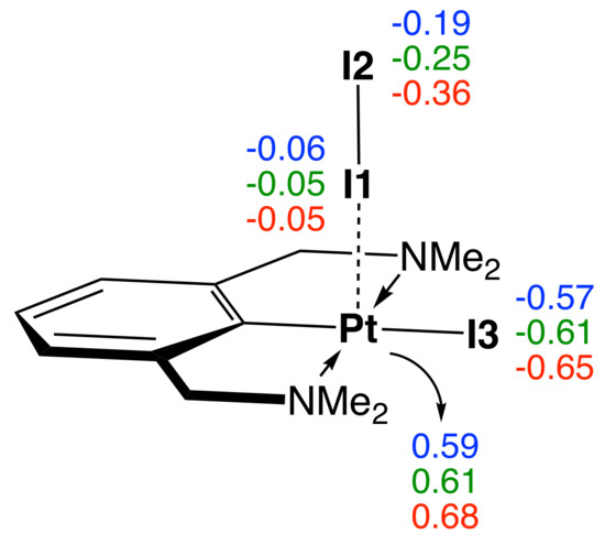 To assess potential solvent effects on the M–I and I–I bonds strengths, complex 1 was investigated in the gas phase and in solution, using benzene as a model for a non-polar solvent, and acetone as a model for a polar solvent. According to Table 2 and Figure 7, the Pt–I1 bond is the weakest in the gas phase, followed by benzene solution, and acetone solution ( values of 0.477, 0.564, and 0.595 mDyn/Å, respectively). This result reveals that solvent polarity does affect the Pt–I1 bond strength, where both the polar and the non-polar solvents strengthen the interaction compared to the gas phase. However, the solvent effect is reversed for the I1–I2 bond, as reflected by the decreasing values of the local mode force constant ( values of 1.100, 0.955, and 0.640 mDyn/Å, for the gas phase, benzene, and acetone solutions, respectively). Similarly, we observe decreasing local mode force constants for the Pt–I3, Pt–N, and Pt–C chemical bonds. Figure 7 shows also the NBO atomic charges of the Pt and I atoms in the gas phase and in both solutions. The positive NBO charge on the Pt atom is increasing from the gas phase, followed by the benzene, and the acetone solutions (NBO charge values of 0.59, 0.61, and 0.68 e, respectively). The charge on the I1 atom remains almost unchanged (NBO charges of −0.06, −0.05, and −0.05 e, respectively), and the charge on the I2 atom becomes more negative in the same series (NBO charges of −0.19, −0.25, and −0.36 e, respectively). Increased polarity of the solution polarizes the Pt–I1–I2 3c–4e bond and increases the electron density transfer to the antibonding orbital of the I1–I2 bond decreasing its strength. The results of our calculations in solutions are consistent with the gas phase calculations of all complexes presented in this study, showing that the strength of the M–I and I–I bonds in the M–I–I system are inverse proportional, which makes the Pt–I1 bond stronger in the more polar solvent.