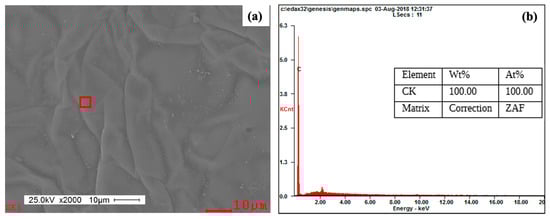 Images showing (a) the SEM micrograph of PG and (b) the EDAX spectrum of single peak carbon. The inset in (b) is the weight and atomic fractions of carbon in graphite.
