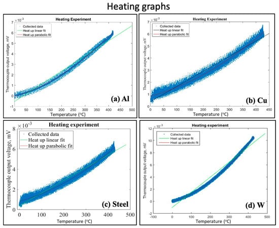 Voltage-temperature plots for (a) PG-Al, (b) PG-Cu, (c) PG-Steel, and (d) PG-W TCs obtained from experimental data upon heating to 500 °C.