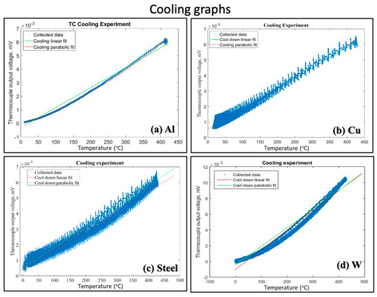 Voltage-temperature plots for (a) PG-Al, (b) PG-Cu, (c) PG-Steel, and (d) PG-W TCs obtained from experimental data upon cooling from 500 °C to room temperature.