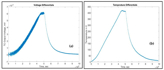 The operation of thermocouples constitutes a means for converting thermal energy to electrical energy. TCs are active sensors and therefore are capable of producing their own thermoelectric power [12]. The thermoelectric effect involves transforming temperature differences in material to voltage. The reverse also holds true for this phenomenon. This encompasses the Thomson, Seebeck, and Peltier effects. The operation of TCs follows the Seebeck principle [17]. A TC has the ability to produce an electromotive force (emf) by converting thermal to electrical energies. The emf measured as an electric potential (voltage) produced by the temperature difference is called the Seebeck effect. The constant of proportionality is therefore the Seebeck coefficient (S) or the thermopower, Equation (1). The Seebeck coefficient represents how sensitive a thermocouple is [18].