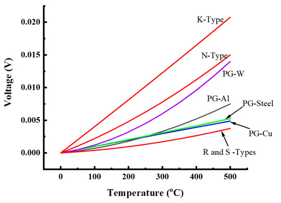 Overall, the thermopower of all four thermocouples compares favorably with some of the commercially available thermocouples (Figure 6). With the exception of the K-type which has Seebeck coefficient > 40 µV/°C [39], the N-type compares favorably with the PG-W which is the best performing TC among the custom TCs. The R and S thermocouples have Seebeck coefficients ranging between 5 and 10 µV/°C. These performances are in fact lower than the performances of the custom TCs whose Seebeck coefficients range between 14 and 26 µV/°C (see Table 2).
