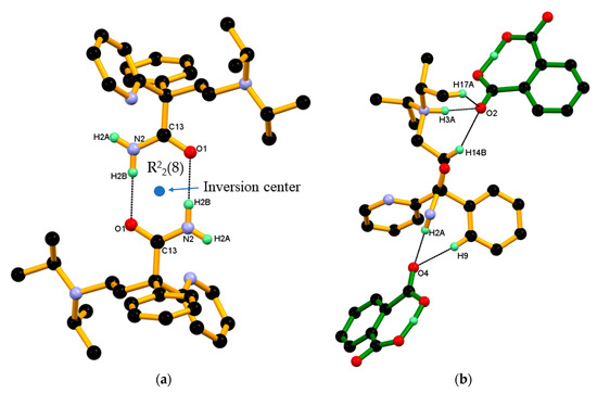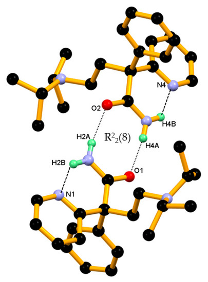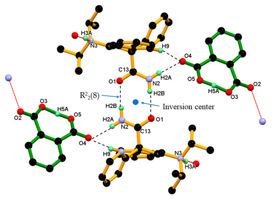 In the crystal structure of DPA_PA salt, two inversion-symmetry related protonated DPA molecules form amide homodimer, via a pair of strong N2–H2B···O1 hydrogen bonds in R22(8) ring motif that involve two acceptor and two donor atoms. In this association, protonated DPA donates amide hydrogen N2–H2B to amide carbonyl (C=O1) oxygen of inversion-symmetry related protonated DPA molecules in dimeric N2–H2B···O1 hydrogen bonding interaction. Further, this amide homodimer of protonated DPA molecule linked to two PA anions through N2–H2A∙∙∙O4 hydrogen bonding interaction between the second hydrogen of amide N2–H2A and carbonyl (C=O4) oxygen of the carboxyl group of the PA¯ anion and further supported by C9–H9∙∙∙O4 interaction, between C9–H9 hydrogen of the phenyl ring of protonated DPA and carbonyl (C=O4) oxygen of the carboxyl group of the PA¯ anion resulting basic dimeric unit shown in Figure 9.