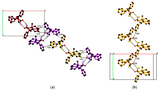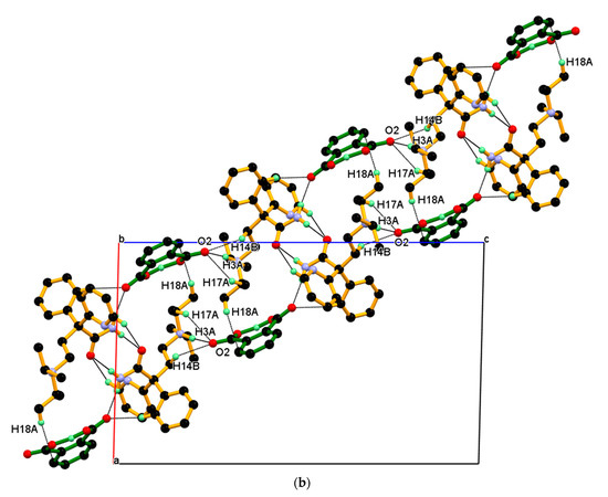 (a) Packing view of the dimeric unit down the c-axis, resulting in a 1-D chain of dimeric unit containing an alternate arrangement of vertically and horizontally oriented dimeric unit along the ab-diagonal; they are associated through alternate C10-H10∙∙∙O2, C11-H11∙∙∙Cg4, and C32-H32∙∙∙Cg2, C42-H42A∙∙∙Cg4 interaction and (b) Packing of dimeric unit along the b-axis resulting in a helical chain of the dimeric unit, linked through C2-H2∙∙∙O2 interaction.