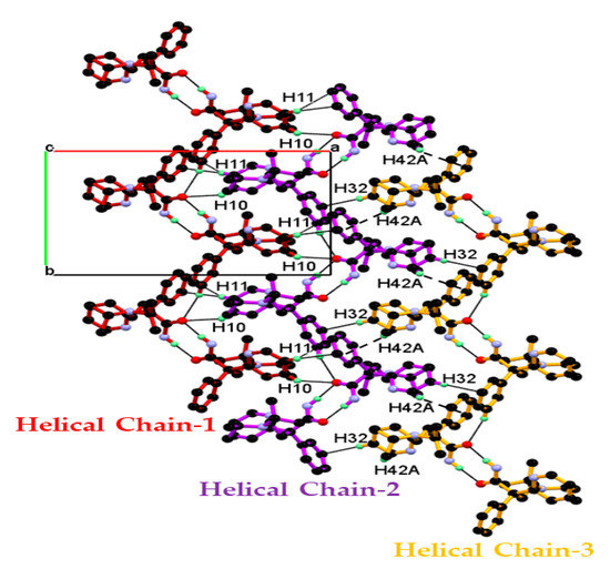 Combining the above mentioned packings resulted in the 2-D packing of the dimeric unit in the ab-plane, as shown Figure 5. In this packing, the neighboring helical chain of the dimeric unit packed in the ab-plane through the alternate C10-H10∙∙∙O2 C11-H11∙∙∙Cg4, and C32-H32∙∙∙Cg2, C42-H42A∙∙∙Cg4 interaction generate the 2-D packing of the dimeric unit in the ab-plane, as shown in Figure 5.