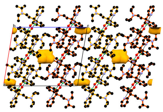 Furthermore, such 2-dimensional structure of the dimeric unit assembled loosely due to the absence of strong interaction along the c-axis. In this direction, that is, along the c-axis, the 2-D network of dimeric units interact with each other by weak non-covalent interactions and hydrophobic forces between adjacent phenyl and iso-propyl groups and such packing of dimeric unit in the ac-plane creates a solvent assessable void of size 54.85 Å3 per unit cell and 1.4% of unit cell volume, calculated by using contact surface from Mercury 2020, 2.0 software [54] shown in Figure 6. Crystal with assessable solvent void is recently reported in [55].