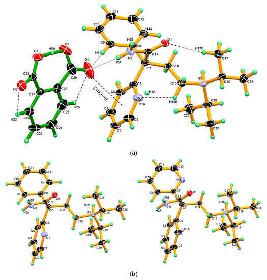 We are going to focus on the crystallization and crystal engineering research on active pharmaceutical ingredients (APIs), particularly on improving the physicochemical properties of drug molecules by undertaking polymorphic study [45], making multi-component crystals [46], such as its solvates [47], cocrystals [48], and salts [49]. In this report, we discuss the X-ray single-crystal structure of the lower melting temperature form of DPA and novel DPA_PA salt [Phthalic acid (PA), Figure 1b], detailed crystal structure analysis and its characterization.