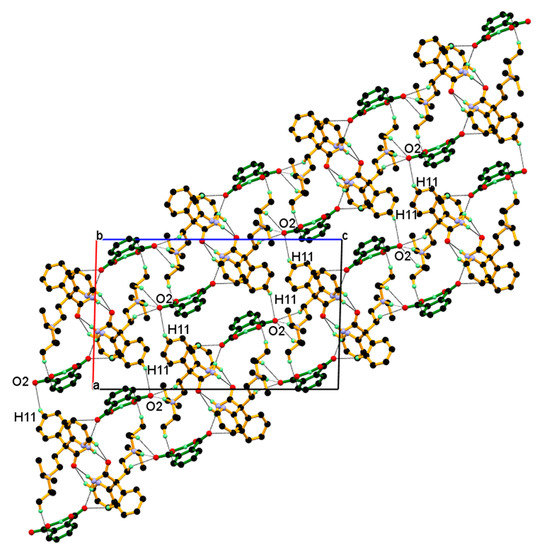 Further, such a two-dimensional network of dimeric unit assembled centrosymmetrically along the a-axis (parallel to the ac-diagonal) through longer and weak C11–H11∙∙∙O2¯ interaction between C11-H11 hydrogen of the phenyl ring of protonated DPA and carboxylate (COO¯) O2-oxygen of PA¯ anions resulting in three-dimensional packing of the dimeric unit in the ac-plane, as shown in Figure 11.
