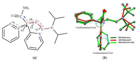 DPA (Figure 12a), has freely rotatable groups connected to asymmetric carbon marked by a star and anticipated to display conformational or orientational changes in its solid forms. The structural overlay of the DPA molecule by overlapping the (C-C-C-N) backbone chain, shown in Figure 12b, reveals conformational and orientational differences owing to rotational freedom around the C−C, C-N bonds. Conformational difference in both solid forms could be characterized by torsion angles τ1, τ2, τ3 and τ4 as shown in Figure 12a, and the dihedral angle between the phenyl and 2-pyridine moieties and values listed in Table 3. In pure DPA crystal structure, both conformers in the pure DPA crystal display slight difference in torsion angles τ1 (−179.78, −171.37), while values of τ2 (177.67, 177.17) and τ3 (−1.01, 3.01) are comparable and indicate that the (C-C-C-N) backbone chain moiety connecting to the phenyl ring are nearly coplanar in molecule A, while there is a slight deviation observed in coplanarity in B molecules. On the other hand, the 2-pyridine ring is roughly perpendicular to the planar part of A and B molecules. The dihedral angle between the phenyl and 2-pyridine rings is 87.16° and 79.83° in molecules A and B, respectively. In DPA_PA salt crystal structure, the torsion angles τ1 and τ2 are −177.58°, −175.47° suggesting coplanarity in the backbone chain as pure DPA, whereas torsion angles τ3 −16.81° indicate deviation in coplanarity in backbone chain moiety and the phenyl ring. Further, the dihedral angle between the phenyl and 2-pyridine moiety is significantly changed to 59.43°and such deviation in orientation of 2-pyridine and phenyl moiety could be due to the association of salt former (PA) with drug (DPA) through hydrogen bond in this direction. However, the torsional value τ4 is for the orientation of the amide group with a planar part; it is nearly similar for both conformers in pure DPA, and such orientation of the amide group brings 2-pyridine moiety close enough to facilitate an intramolecular hydrogen bond between amide N-H hydrogen and N-atom of 2-pyridine moiety. Whereas in the DPA_PA salt a conformational twist is observed at amide group as shown in Figure 12b to facilitate the intermolecular hydrogen bond between amide N-H hydrogen of protonated DPA and carbonyl oxygen (C=O) of the carboxyl group PA¯ anion. Moreover, iso-propyl moiety present on tertiary nitrogen in all molecules shows conformational/orientational difference.