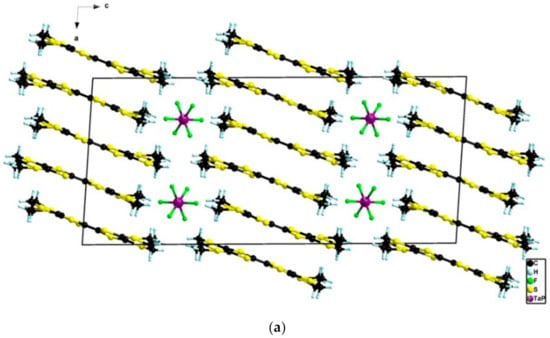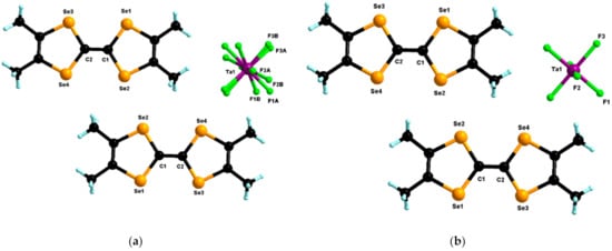 In the first set of experiments, we investigated the electrocrystallization of TMTSF with mixtures of (n-Bu4N)TaF6 and (n-Bu4N)PF6 of three different molar starting compositions, i.e., 0.8/0.2, 0.5/0.5 and 0.2/0.8, referred to as “nominal”, keeping in mind that the use of the mixture Ta/P 0.8/0/2 was reported to provide (TMTSF)3Ta2F11 []. For comparison reasons we also prepared the classical Bechgaard phase with 100% TaF6– and reported its accurate crystal structure at room temperature and also 100 K because these data were not recorded in the CCDC. Accordingly, the electrocrystallization of TMTSF with pure (n-Bu4N)TaF6 properly prepared according to our own protocol [] provided the expected Bechgaard salt (TMTSF)2TaF6 as black needles, crystallizing in the centrosymmetric triclinic space group P–1 with one independent donor and half an anion in the asymmetric unit with the Ta center being located on an inversion center. A thorough structural resolution at room temperature clearly indicated disordered fluorine atoms with site occupation factors (s.o.f.) of 0.61/0.39 A/B while the disorder was removed at 100 K (Figure 1).