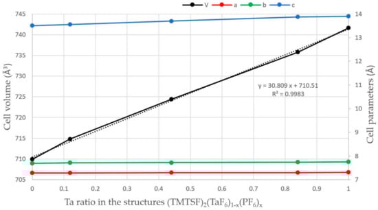Variation of the cell parameters a (red), b (green), c (blue) (Å) and cell volume (Å3) (black) in the structures (TMTSF)2(TaF6)1−x(PF6)x. The black dotted line is the linear regression curve for the variation of the cell volume.
