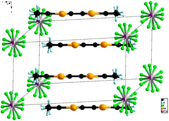 The substitution of PF6– by TaF6– in the structure of the Bechgaard phase provoked a steady increase of the crystalline cell volume from 709.9 Å3 for the phase 100% P [] to 741.6 Å3 for the phase 100% Ta. The analysis of the cell parameters showed that a and b increased only very slightly, i.e., by 0.033 and 0.062 Å, respectively, while the c parameter expanded much stronger, by 0.39 Å (Figure 2). This anisotropic variation was not unexpected as it is along c that the shortest intermolecular donor···anion distances were observed as weak CH···F hydrogen bonding interactions while along a and b anion···anion distances were much longer and thus these directions were relatively insensitive to the size of the anion.