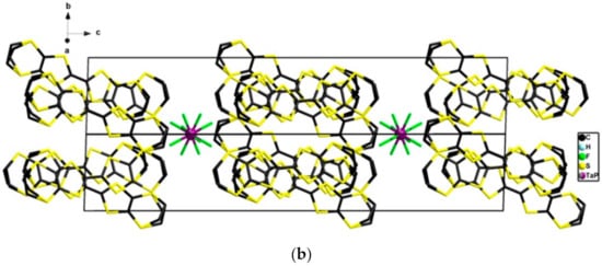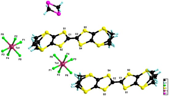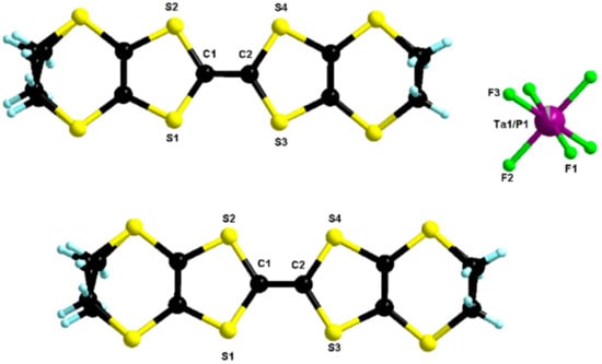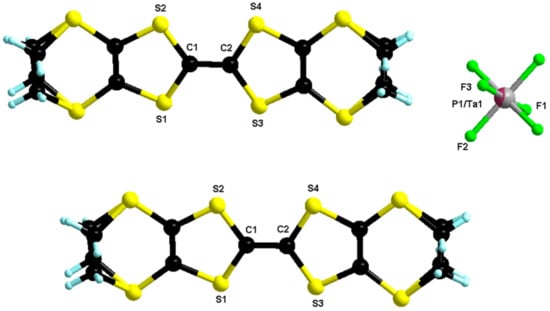 When the electrocrystallization experiment was performed with pure (n-Bu4N)TaF6, the already known orthorhombic δo-phase (BEDT-TTF)2TaF6 [], reminiscent of the orthorhombic β-(BEDT-TTF)2PF6 phase [], was obtained as black needles together with black platelets of (BEDT-TTF)3Ta2F10O as a side product. Curiously, the use of a nominal mixture Ta/P 0.2/0.8 provided needle-like crystals (Figure S13) of the same orthorhombic δo-phase in the group Pnna, formulated as δo-(BEDT-TTF)2(TaF6)0.43(PF6)0.57, with one independent donor and half an anion in the asymmetric unit (Figure 4). Clearly, the TaF6– anion adapted easier than PF6– to this structural type.