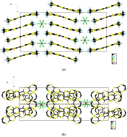 - Pop, F.; Auban-Senzier, P.; Canadell, E.; Avarvari, N. Anion size control of the packing in the metallic versus semiconducting chiral radical cation salts (DM-EDT-TTF)2XF6 (X = P, As, Sb). Chem. Commun. 2016, 52, 12438–12441. [Google Scholar] [CrossRef]