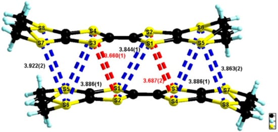 The value of the central C=C bond length of 1.386(5) Å together with those of the internal C–S bonds ranging between 1.720(4) and 1.721(4) Å (Table S5) were in agreement with an oxidation state +1 of the donor. In the packing, the donors formed isolated dimers of a bond-over-ring type with intermolecular S···S distances in the range 3.66–3.92 Å (Figure 9).