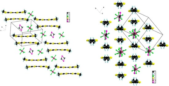 The successive dimers were separated in the stacking direction by anions and solvent molecules with no organic-inorganic segregation being observed in the packing (Figure 10).