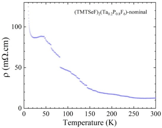 The temperature dependence of the resistivity was measured only for the (TMTSF)2(Ta0.2P0.8F6)-nominal corresponding with (TMTSF)2(TaF6)0.12(PF6)0.88, as determined by X-ray diffraction in a two contacts configuration. Despite a small localization below 250 K due to micro-cracks in the needle and to the resistance of the contacts, the ρ (T) curve in Figure 11 clearly shows the transition towards the spin density wave ground state around 12 K as observed in pure (TMTSF)2PF6.