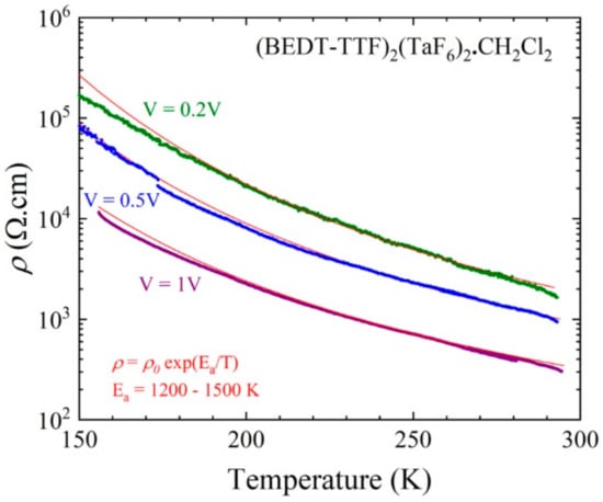 Temperature dependence of the electrical resistivity of a single crystal (#3) of (BEDT-TTF)2(TaF6)2·CH2Cl2 plotted as log ρ versus T measured with different applied voltages: 0.2, 0.5 and 1 V. The red line is the linear fit to the data giving the activation energy Ea.
