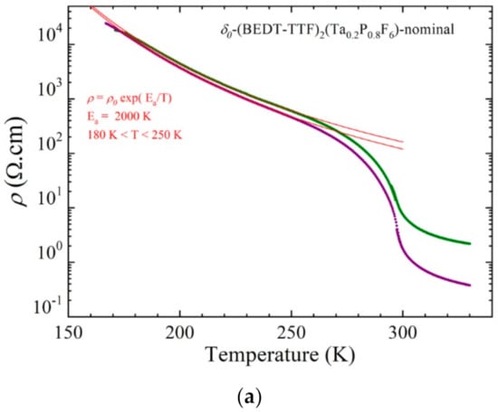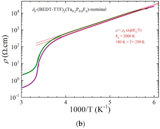 The temperature dependence of the resistivity (Figure 13) showed an activated behavior at a low temperature (below 250 K) with an activation energy of 2000 K (0.17 eV). A transition between the two semiconducting phases was observed at 296 K (as determined by the maximum of the derivative of log ρ versus 1/T), which paralleled the anomaly observed around 280–300 K in the resistivity curves of the pure δo- and δm-(BEDT-TTF)2TaF6 phases and identified as a charge ordering transition [].
