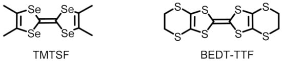 - Mori, T. Organic Conductors with Unusual Band Fillings. Chem. Rev. 2004, 104, 4947–4969. [Google Scholar] [CrossRef]
