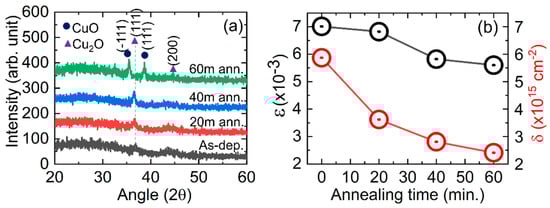 It should be noted that the very low peak height in all of the films’ XRD patterns, as shown in Table 1, indicates the retention of the amorphous phase in the films. Particularly, the amorphous phase should be reduced with thermal annealing since more energy is supplied for recrystallization and an improvement in the crystallinity of the CuxO thin films; however, no significant change was observed in this study. The recrystallization of the film during thermal annealing may be impacted by N- and/or O-doping; thus, the film crystallinity is unable to be dominant. The average crystallite size of the films was calculated using the Debye–Scherrer formula [28]. From Table 1, it can be seen that the average crystallite size of CuxO is increasing with the increase in annealing time, which is in the range of 16–20 nm. The increase of crystallite size gives an indication of the recrystallization of the film upon thermal annealing. Moreover, the micro-strain () and dislocation density () were also calculated using the formula mentioned in the literature [28], and the findings are shown in Figure 1b. Particularly, ε and δ could be developed in the films via substitution, relocation of the atoms, and/or scattered grain distribution. Hereby, we found that the and for the plane () are reduced in the case of all the thermal-treated films. It may have occurred due to an increase in grain size and grain distribution upon thermal treatment. Also, the reduction of and may have occurred due to the replacement of Cu2+ and O2− atoms in their reference lattice during thermal annealing.