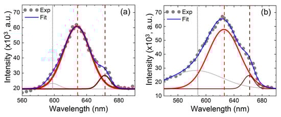 Figure 3 shows the PL emission spectra of the CuxO thin film for as-deposited and 40 min annealed films. To determine the accurate peak positions, the peak has been fitted using Gaussian fit. The luminescence at around 600 nm is related to excitons [37], the peak at 630 nm is associated with the direct band-to-band recombination of the phono assisted exciton [38,39], and the peak at around 665 nm is attributed to the recombination of excitons bound to double-charged oxygen vacancies (VO2+) [40]. It has also been reported that the PL emission around 600–630 nm is associated with the direct bandgap of high-quality CuxO thin films [41]. CuO has been reported to have a weak PL signal in the wavelength range of 620–900 nm [42]; thus, the strong peak at around 630 nm found in this study may be represented by Cu2O crystals, which are also supported by the XRD analysis. It can be seen that the exciton luminescence and band-to-band recombination luminescence are higher for the annealed film than as-deposited films, which indicates that the crystalline quality improves after annealing. The peak associated with oxygen vacancies is observed to reduce after thermal annealing for 40 min, which suggests the reduction of oxygen vacancy or increase of oxygen content in the film upon annealing. The increase of oxygen content has also been confirmed by the Energy-dispersive X-ray spectroscopy (EDX) measurement, as shown in Figure 3.