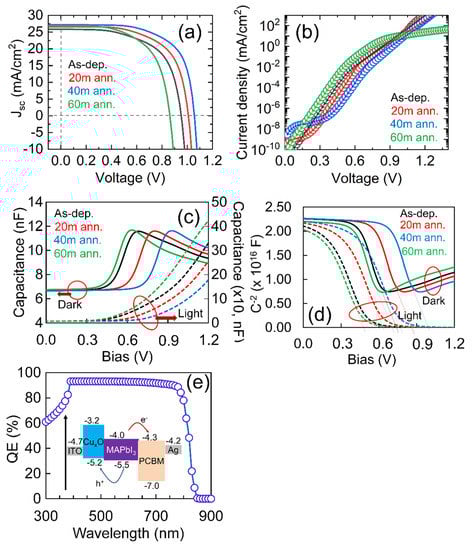 (a) The light current density-voltage (J-V) curves, (b) Semi-log plot of dark current-voltage (I-V) curve found for PSCs with different CuxO thin films, (c,d) shows the capacitance-voltage curves in light and dark mode for the modeled PSCs and (e) shows the external quantum efficiency (EQE) for the highest-efficiency PSC using 40 m annealed CuxO thin film (inset shows the schematic band diagram of the PSC used in this study).