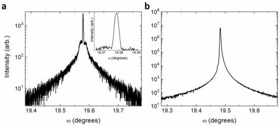 In 1973, Miyazawa [82] tried to melt bulk LN crystals onto a LiTaO3 substrate to obtain a thin film of LN using a method he called epitaxial growth by melting (EGM). Although Miyazawa [82] was able to show some light propagation within the film, the crystal quality was poor, and optical losses were >5 dB/cm [19]. Miyazawa then decided to use LPE instead in Kondo et al. [20], looking at Li2O-V2O5 as a flux material, and was able to grow high-crystallinity single-crystal LN on LiTaO3 substrates, although the surface was rough and with many microcracks. Despite the film imperfections, the LPE growth in Kondo et al. [20] performed much better than EGM, with optical losses of 5 dB/cm, but at visible wavelengths, a 20–30 dB/cm optical loss was measured [19]. Ballman et al. [18] then looked at four additional flux systems, two with Li+ rich environments and two with a Nb+ rich environment. Ballman et al. [18] found that by using a Nb+ rich flux system and growing at a higher temperature, they could adjust the Li/Nb ratio in the melt to obtain lattice parameters that better matched the substrate. They also looked at different crystallographic orientations of the substrate and combined those results with an annealing process in order to grow smoother films. Ballman et al. [18] were largely successful at demonstrating optical waveguiding in LPE LN films, reporting optical losses of 1–5 dB/cm at 632.8 nm. The optical losses observed decreased with a higher crystallinity film due to scattering reduction [18,19]. Baudrant et al. [21] then used the flux system in Kondo et al. [19,82], Li2O-V2O5, and looked at different crystallographic orientations of the substrate to improve growth quality, thereby obtaining results that suggest a layer-by-layer growth mechanism of LN [21]. In 1991, Tamada et al. [22] used the same Li2O-V2O5 flux system to grow on lattice-matched (0.08% mismatch) MgO-doped LN substrates, achieving high-quality thin films with an XRD rocking curve of 11 arcseconds, but still saw large optical losses of 25 dB/cm at 514.5 nm. However, Tamada et al. [22] were able to characterize and reduce the optical losses caused by vanadium incorporation from the flux using a 600 °C ozone anneal. Later, Tamada et al. [22] produced a high-quality LN film with a low optical loss of 1.6 dB/cm, even though they were not able to remove all of the vanadium impurities. Consequently, Yamada et al. [23] later utilized a Li2O-B2O3 flux system to grow comparatively high-quality films with XRD rocking curves of 11.4 arcseconds, as shown in Figure 3, but this time without any detectable impurity inclusions and, therefore, lower optical losses of <1 dB/cm at 458 nm. Efforts toward the LPE epitaxy of LN continue and have looked at alternative growth parameters, such as using K2O fluxes [24], doping [25], and even using LPE to grow LN waveguides in laser cut channels [26] and continue as one of the lowest optical loss sources for single crystal epitaxial LN [23].