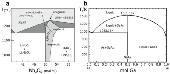 Lithium niobate is a remarkable crystal and, in many ways, is anomalous in the chemical world. Lithium (Li) is among the most reactive elements known, has an enormous vapor pressure compared with most elements, and readily forms stable oxides. On the other hand, niobium (Nb) is very slow to form oxides [76] and has a negligible vapor pressure except at extreme temperatures. Furthermore, Nb forms compounds of various oxidation states leading to a strong tendency to form undesirable phases, often with overlapping phase space windows resulting in undesirable multi-phase films [78]. This complexity is further exemplified by the comparison of the phase diagrams of bulk LN [78] and gallium arsenide [79] (GaAs), as shown in Figure 2. LiNbO3 is not like most other crystals, as its congruent melting point favors a Li2O-deficient stoichiometry that is difficult to reproduce outside of bulk crystal growth. Creating particular difficulty is the fact that unlike all commercially successful materials that use epitaxy, exemplified by GaAs in Figure 2b, LiNbO3 does not have a line composition. Line compositions assure that regardless of the anion to cation ratio over a wide applicability range, nature takes care of forming the desired crystalline phase—GaAs in this example. In MBE, for instance, GaAs is formed whether the As to Ga flux ratio is 3:1 or 40:1. The difficulty of this lack of line composition for LN epitaxy cannot be understated. Thus, any change in the flux ratio of the cations to each other or cations to anions can result in a different stoichiometry or even multiple phases. Different ratios of Li to Nb form slightly differing material and this stoichiometry effects optical and acoustic properties as well as phase and crystal structure (LiNbO3, LiNbO2 [80,81], LiNb3O8 [39,49,80], Li3NbO4 [39,49,80]) by single digit percentage changes in fluxes. The lack of a line composition affects every aspect of LN epitaxial research, results in extreme tolerance limits on required flux ratios, and if commercial epitaxy is to ever be achieved, will dominate the challenges of scalability, uniformity, and yield.