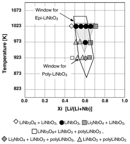 A pseudo-phase diagram varying the Li and Nb feed composition with growth temperature that shows growth windows for single and multiple phase LN epitaxy via MOCVD by Akiyama et al. [49].