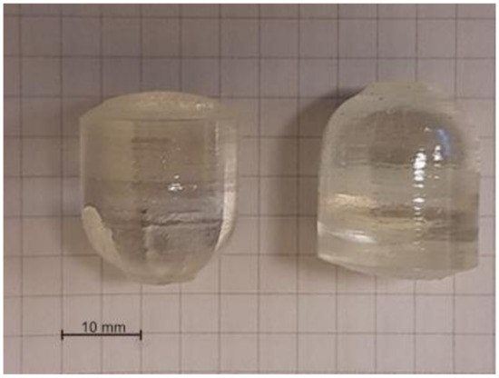 LiNb0.88Ta0.12O3 and LiNb0.5Ta0.5O3 crystals, grown by the Czochralski technique were used in this study. LiNb0.88Ta0.12O3 was grown at the Institute of Microelectronics Technology and High Purity Materials, Russian Academy of Sciences, Chernogolovka, Russia (IMT). This crystal was grown along the polar axis Z in a Pt crucible (diameter of 60 mm and height of 60 mm). Congruent LiNbO3 and LiTaO3 crystals were used as initial charges. The pulling rate of crystals from the melt was about 0.5 mm per hour. The obtained crystal boules have a diameter and a length of about 20 mm each as shown in Figure 1. The composition of the grown crystals was determined using mass spectrometry with inductively coupled plasma (XSeries II Thermo Scientific spectrometer, Waltham, MA, USA). The full report about the growth process and structural parameters of the obtained crystal is given in [58]. Additionally, the composition of LiNb0.88Ta0.12O3 was studied by energy-dispersive X-ray (EDX) spectroscopy (CamScan 44, Waterbeach, UK). These investigations were performed on two specimens, used for electrical and electromechanical measurements, which are described in Section 2.2. The Nb/Ta ratio was determined along the diameter of the specimens as a line scan with 0.8 mm step. In total 10 measurements per specimen were performed and the uncertainty of the measurements did not exceed 5%. The results are summarized in Table 1. Most important, an insignificant inhomogeneity and small differences in Nb/Ta distribution between two specimens are observed.