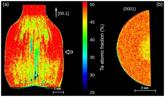 Figure 2a shows the distribution of tantalum (atom fraction = [Ta]/([Ta] + [Nb])) over the whole measured sample area. Although integral compositional variation along the growth direction is small, there exist longitudinal structures with drastically reduced tantalum contents. These structures were the result of cellular growth owing to constitutional supercooling and occur mainly in regions of higher local growth velocity, i.e., the conical part with increasing crystal diameter and in regions with poor solute exchange in the melt, i.e., near the rotation axes. Figure 2b shows the distribution over a (0001) sample cut perpendicular to the growth direction from the approximate axial position indicated by the arrow in Figure 2a. The mean LiTaO3 fraction measured over the full diameter of this sample was 48% with an RMS of 1.4%. Figure 3 presents the distribution of LT fraction along the diameter of the sample, presented in Figure 2b. The measurement was performed along the vertical right edge.