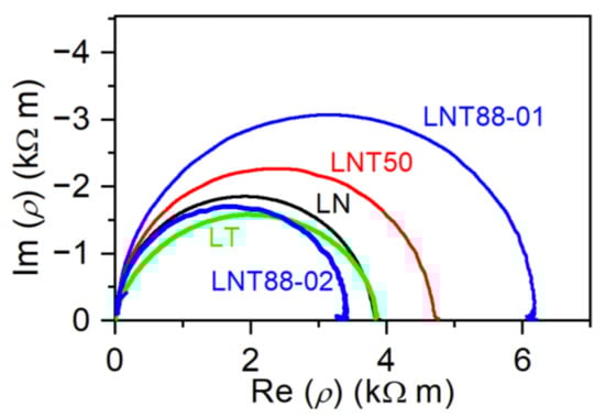 A Nyquist plot is exemplary given in Figure 4 for the studied specimens at 600 °C. The representation of the resistivity is chosen to eliminate the geometrical factors of the samples (thickness and area). As seen from the figure, slightly depressed semicircles with almost similar resistance were obtained for LN and LT specimens. Such depression results from non-ideal capacitances and corresponds to exponents of the constant phase elements of 0.98 and 0.87 for LiNbO3 and LiTaO3 respectively. The corresponding exponents for LNT50 and LNT88-01 and LNT88-02 samples were equal to 0.98, 0.99 and 1.00 respectively. Further, as seen from Figure 4, the LNT88-01 and LNT88-02 specimens, which were manufactured from the same crystal boule are exhibiting different resistivity. This peculiarity will be discussed in the subsequent section.