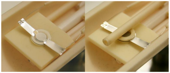 The investigations of acoustic losses were carried out by means of resonant piezoelectric spectroscopy (RPS) on LNT resonators, operated in the thickness–shear mode (TSM) and in the thickness mode (TM). Similarly to conductivity studies, these measurements were performed in air during heating with a rate of 1 K per min from RT to 700 °C. The samples were electrically contacted using platinum foils on each side of the sample. With the objective to minimize damping from mechanical contact, only small areas near the edges of the samples were electrically contacted and mechanically clamped (Figure 5). The electrodes overlapped only in areas that were not mechanically clamped.