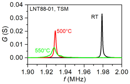 The real and imaginary parts of the impedance spectra were measured in the vicinity of the resonance frequency using a high-speed network analyzer (Agilent E5100A, Hewlett-Packard, Santa Clara, CA, USA). Subsequently, the impedance was transformed into admittance Y = Z−1 and a Lorenz function was fitted to its real part (conductance G). This enabled determination of the resonance frequencies of the fundamental mode and of the subsequent harmonics and of the Q-factor for a given mode. Detailed description of data acquisition is given in [2]. Figure 6 exemplarily shows the real part of admittance, acquired for the LNT88-01 specimen at different temperatures. The frequency corresponds to the 1st harmonic of the TSM resonator. As seen from the figure, the resonance frequency (i.e., the conductance maximum) shifts with the temperature towards lower frequencies. Further, a broadening of the peak is observed at elevated temperatures. This implies an increase of the losses, which will be discussed in detail in Section 3. At 550 °C on the right shoulder of the conductance peak another small peak is observed at about 1.935 MHz, which is interpreted as a spurious mode and understood to originate from the “activity dips” phenomenon [60] (see discussion in Section 3).