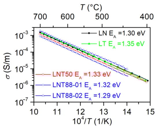 Activation energies and pre-exponential factors, obtained by fitting of Equation (7) to the measured conductivity data are summarized in Table 2. Previously, close values of EA were obtained in [16,30,31,41] for congruent LN and in [23,26] for congruent LT.