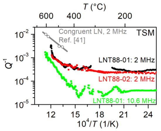 Figure 8 also compares the Q−1 of LNT88 resonators to that of congruent LN specimen, studied previously in [41]. The LN resonator in [41] was prepared as X-cut, operated in TSM and the frequency corresponds to the fundamental mode. In the current study the LNT-88 resonators were prepared as Y-cut discs, however due to the crystal symmetry in both X- and Y-cuts the resonances could be excited in TSM and the material constants, which determine the resonance frequency and electromechanical coupling factor of TSM in X- and Y-cuts are equal (C44 = C55; e15 = e24 and ε11 = ε22) [8,34,35,67]. Remarkably, the losses in LNT88 resonators were substantially lower. We note however, that the results overlapped only partially, since the measurements of the LNT88 fundamental mode did not extend to the range of LN in [41].
