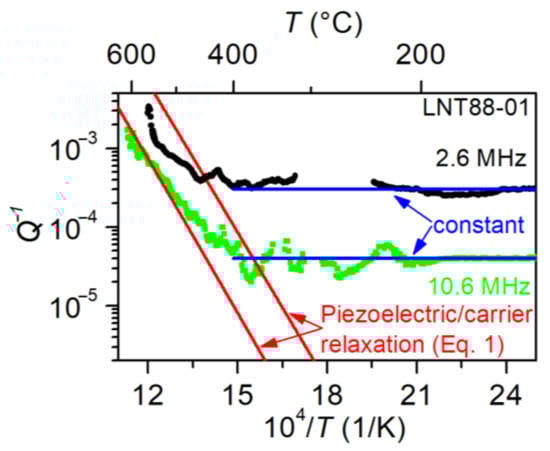 A substantial number of sharp peaks were observed in the raw data for the first harmonic of LNT88-01 between 250 and 350 °C. These peaks are understood to originate from the “activity dips” phenomenon, caused by the coupling of the main mode with other spurious (parasitic) modes [62]. Such coupling does not allow for correct determination of the Q-factor. Therefore, the Q−1 data in temperature ranges where activity dips occurred were removed from the results presented in Figure 8 to provide a more reliable and clear presentation of the measured data.