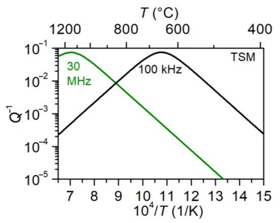 where Δ is a temperature-independent constant proportional to the concentration of the defect species, T is the absolute temperature, ω is the angular acoustic frequency (equal to 2πf), and τ is the reorientation relaxation time of the defect. As will be shown in the subsequent sections, no evidence of dominating anelastic point defect relaxation was observed on Q−1(T) dependencies of the samples studied here so far.
