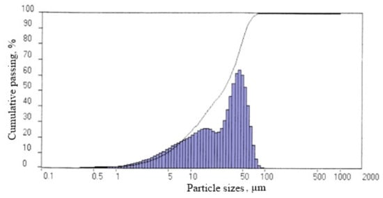 Analysis of the experimental data presented in Figure 2 indicates that the average particle diameter is 34.19 μm, the particle size prevails in the range of 20–45 (35%) and 45–100 μm (23–32%), while more than 99% are particles with a size less than 73.23 μm. The content of particles in the range of 0.05–1 μm is 1%. The specific surface area is 5876 cm2/cm3.