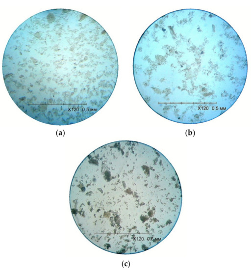 With an increase in the maturation time of the sediment, crystal growth is observed (Figure 3). An increase in temperature to 50 °C during deposition accelerates the formation of a crystal lattice, resulting in the formation of larger crystals. The content of particles with a size of 45–100 µm, which is 33.21%, and the content of particles with a size of 100–200 µm, which is 1.02%, increases.