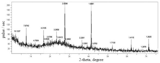 The introduction of aluminum sulfate during the synthesis of the filler leads to an increase in the compressive strength of lime paste with a filler. This filler synthesized from the liquid glass in the presence of precipitating additives CaCl2 in an amount of 45% by weight of the liquid glass and Al2(SO4)3 in an amount of 11% by weight of the liquid glass. Thus, the compressive strength of lime paste with the filler synthesized in the presence of CaCl2 and Al2(SO4)3 precipitating additives is 5.0 MPa, the strength of the reference specimen of lime paste with the filler synthesized in the presence of CaCl2 precipitating additive is 4.6 MPa. Figure 4 shows an X-ray diffraction pattern of the filler synthesized in the presence of CaCl2 and Al2(SO4)3 precipitating additives. In the specimens of the filler synthesized with the joint introduction of CaCl2 and Al2(SO4)3, there are diffraction lines (Å) of the following compounds: calcium silicate hydrates C-S-H (I) and (II): 10.1337; 7.6742; 3.5796; 2.8290; 2.4662; 2.2261; 2.2061; 1.2625; gypsum: 4.3105; 4.3114; 2.2261; zeolites: 3.2658; 1.9981; 1.7130; calcite: 3.8583; 3.0395; 1.4115 aragonite: 1.8782; 1.2976; vaterite: 1.2625. The presence of additional compounds (zeolites, gypsum) and an additional amount of C-S-H type silicate hydrates interacting with lime helps to strengthen the structure of the lime paste.