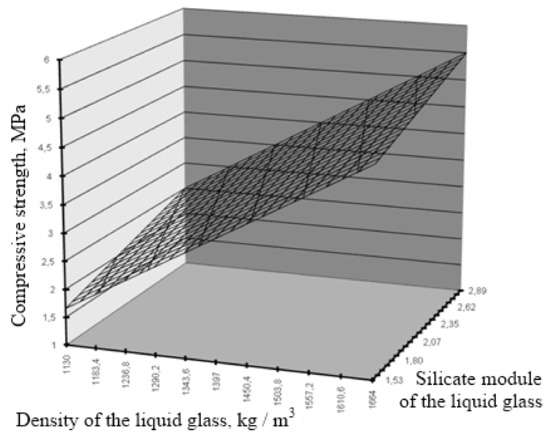The resulting model adequately describes the influence of the investigated factors on the compressive strength of the lime composite. The significance of the coefficients of the regression equation indicates a significant effect of a density and a silicate module on the optimization parameter. The interpretation of the absolute values of the coefficients of the regression equation and their signs indicates the predominant influence of the modulus of the liquid glass on the formation of compressive strength. The graphic interpretation of the resulting model is shown in Figure 5.