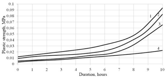 Change in the plastic strength of the specimen 03E depending on the filler synthesis conditions. 1—the filler was synthesized with the rapid introduction of CaCl2 additive in an amount of 90% of the water glass mass, the specific surface of the filler is 5876 cm2/g; 2—the filler was synthesized with the slow introduction of CaCl2 additive in an amount of 90% of the water glass mass, the specific surface of the filler is 4669 cm2/g; 3—the filler was synthesized with the rapid introduction of CaCl2 additive in an amount of 90% of the weight of the liquid glass, and kept for three days, the specific surface of the filler is 4439 cm2/g; 4—lime paste (specimen Ref.).