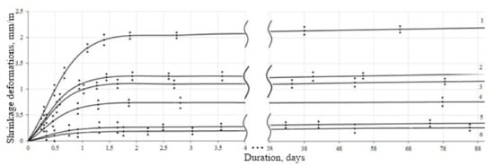 Shrinkage kinetics of finishing mixes: 1—Ref-2; 2—Ref-1; 3—03B; 4—03A; 5—03D+S-3+Neolith 7200; 6—03C+S-3+Pulver DM 1142P.