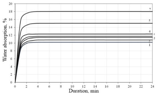 It was found that, during the initial 1–4 min, all samples showed intense water absorption, and subsequently the water absorption indicators stabilized. Water absorption of the composition “water/binder = 1.8, binder:sand = 1: 4” after 24 h was 15% by weight (Figure 10, curve 5), and the composition “water/binder = 1.8, binder:sand = 1:3” was 18%. When a superplasticizer is introduced into the mix, a decrease in water absorption is observed. A lower value of the water absorption index, which is 10.2% at 24 h water absorption (Figure 10, curve 1), is observed in the samples prepared with the use of the Kratasol additive.