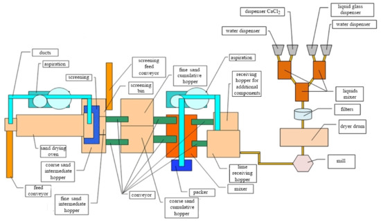 Figure 11 shows the developed technological scheme for the production of the lime dry plaster mix. This technological scheme can be implemented in existing factories of building materials without significant re-equipment of production.