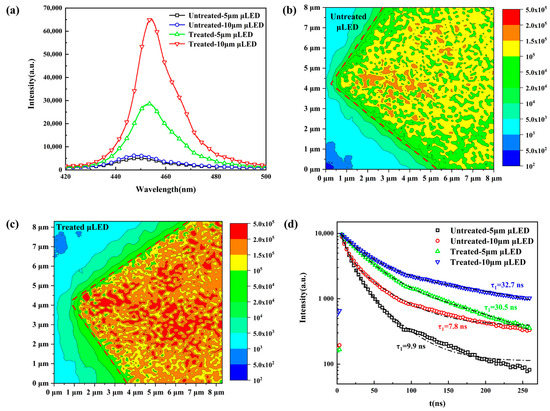 Figure 2b,c illustrate the PL mapping images of 10 μm-radius Micro-LED with and without passivation. All samples share the same measurement parameters. The emission intensity of PL mapping images was divided into 10 levels from 100 to 500,000 in a.u. and marked with different colors. The boundaries of Micro-LED chip are marked by red dash lines in the diagram. Comparing these PL mapping images, it can be found that the passivated Micro-LED had a significantly larger area with luminous intensity above 150,000 in a.u. (orange area). Additionally, more area of high luminous intensity above 200,000 (red area) could be found in passivated Micro-LEDs. In addition, the emission of passivated Micro-LED show more uniform distribution in intensity, which was a benefit for display application. According to the integration of PL intensity, the emission of passivated Micro-LED was about 49% higher than that of the untreated samples. For the emission area with luminous intensity above 100,000 (yellow region), it was estimated that the boundary of the passivated Micro-LED had about 5% expanded area than the untreated samples. Obviously, the SiO